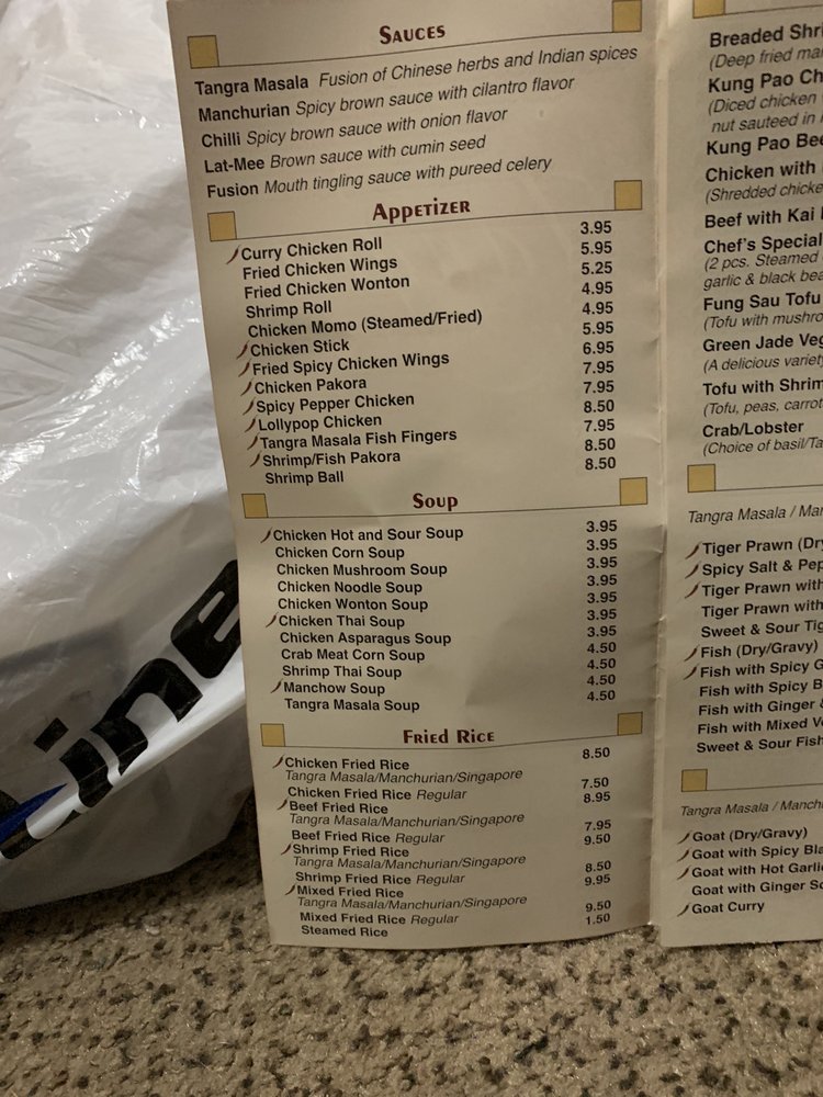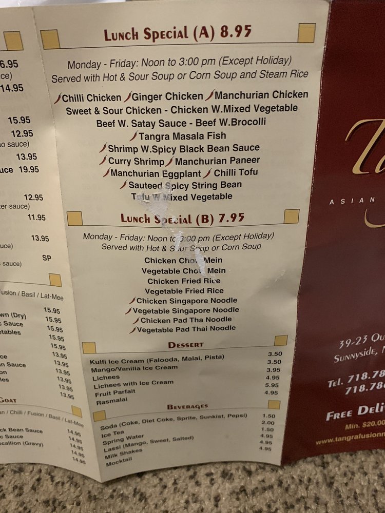 Tangra Asian Fusion Cuisine, located in Sunnyside, NY, offers a unique blend of Indian, Halal, and Asian Fusion dishes. With a variety of options including vegan and vegetarian dishes, this restaurant caters to a diverse range of preferences. Customers rave about the consistent quality and flavors of their favorite dishes like chicken manchurian soup, chicken lollipop, and shrimp fried rice. The spacious and casual ambiance makes it an ideal spot for group gatherings and family dinners. The menu features a wide selection of fusion dishes at reasonable prices, including must-try items like the paneer pakoras and the sizzling chili paneer. Tangra Asian Fusion Cuisine is praised for its authentic decor, prompt service, and late-night dining options. This restaurant is a go-to destination for those craving flavorful and satisfying IndoChinese cuisine.